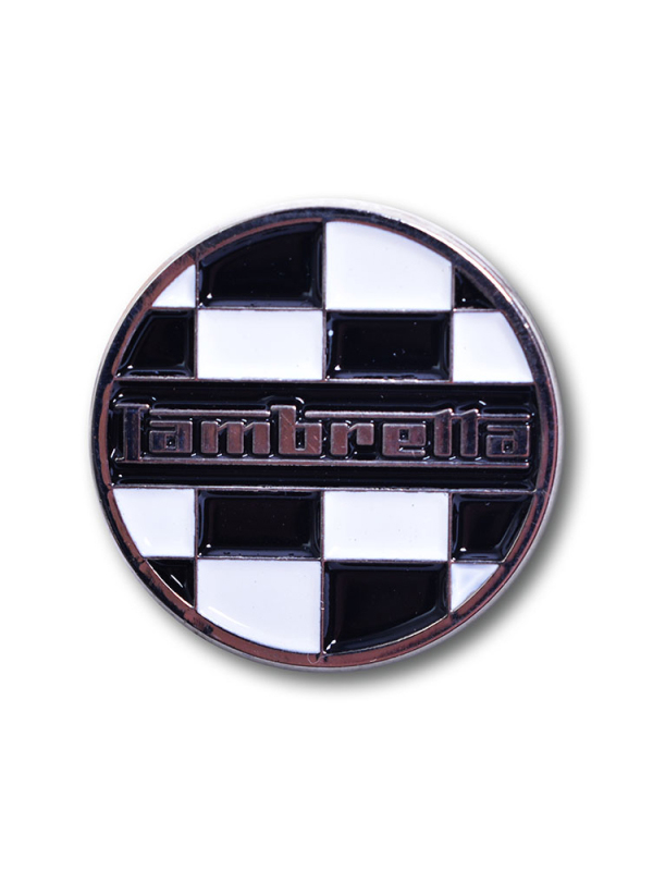 Lambretta enamel metal lapel badge set on a checker board ska effect background.