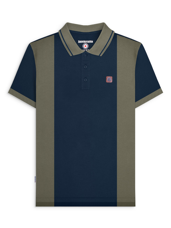 Polo shirt by Lambetta in navy with contrasting stripes in khaki. Small logo on left breast, finished with a khaki colloar and sleeve piping.